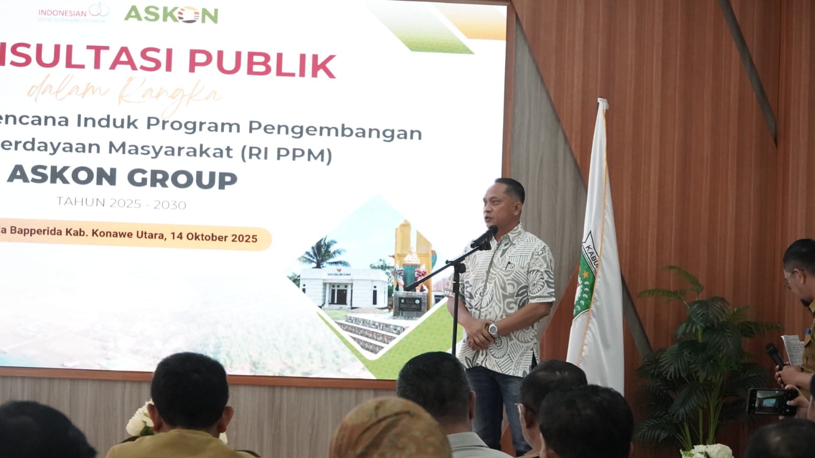 Sekretaris Daerah (Sekda) Kabupaten Konawe Utara, Dr. Safruddin, S.Pd., M.Pd., mewakili Bupati H. Ikbar, SH., MH., secara resmi membuka kegiatan Forum Discussion Group (FGD) Konsultasi Stakeholder dalam rangka penyusunan Rencana Induk Program Pengembangan dan Pemberdayaan Masyarakat (RI PPM) oleh Askon Group, yang menaungi PT Tataran Media Sarana dan PT Kacci Purnama Indah, Senin (14/10/2025), di Aula Bapperida Konawe Utara.