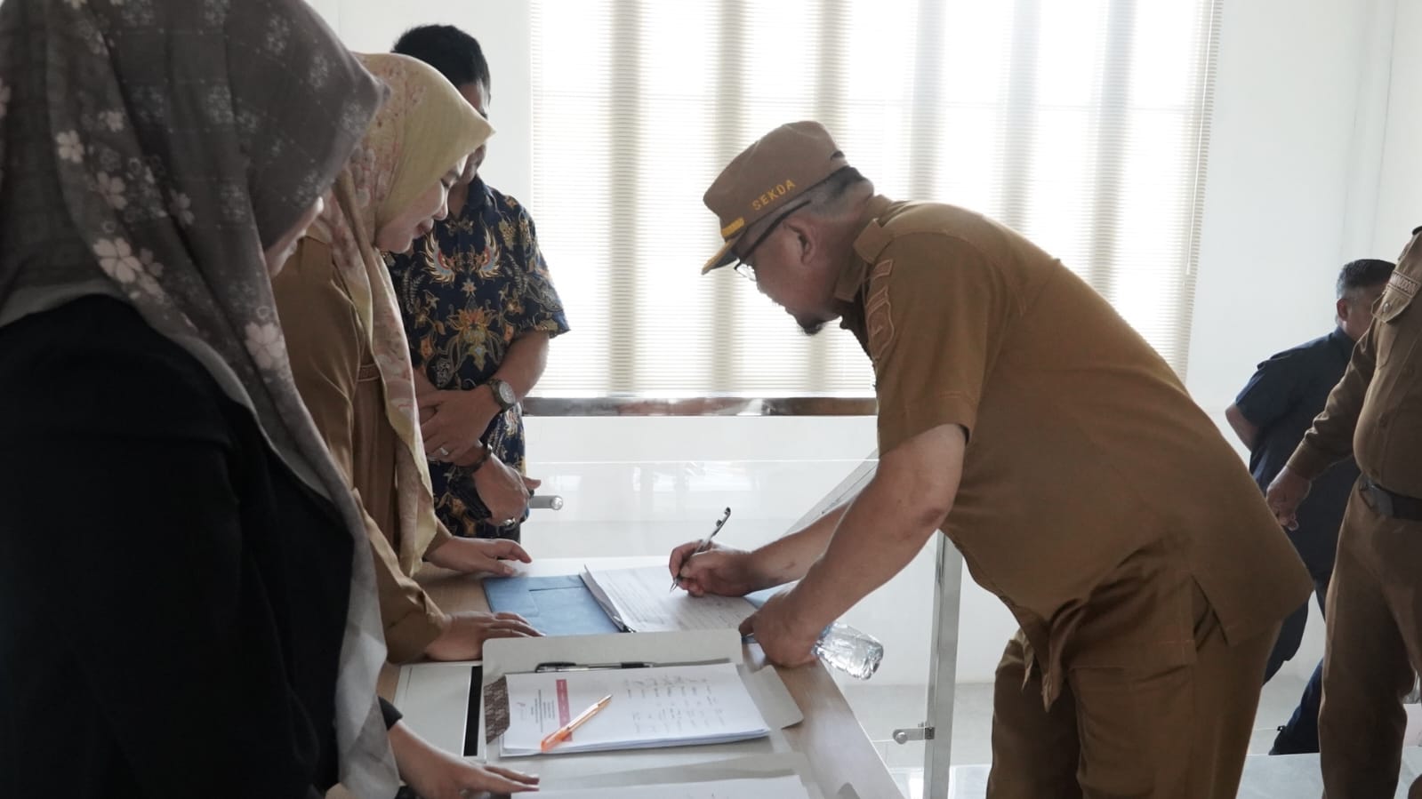 FORUM DISCUSSION GROUP – Sekda Konawe Utara, Dr. Safruddin, S.Pd., M.Pd., menandatangani dokumen berita acara FGD penyusunan Rencana Induk Program PPM yang difasilitasi Askon Group.