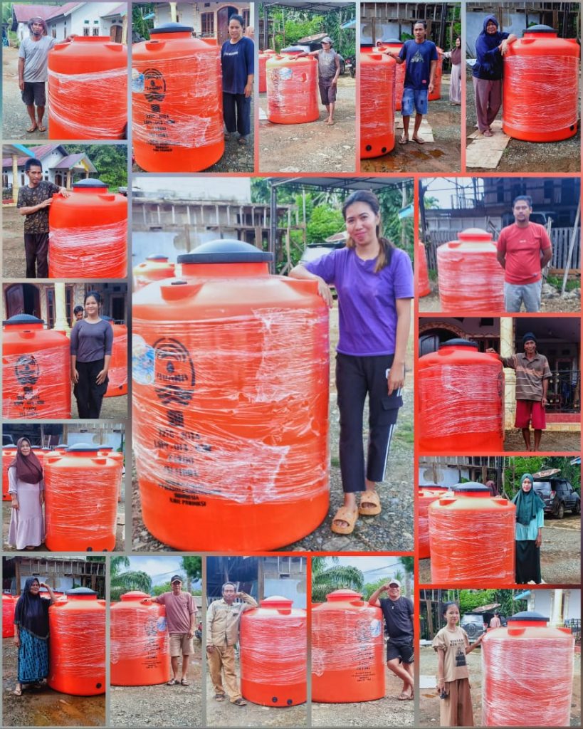Tak berhenti pada sektor ekonomi, Pemerintah Desa Paka Indah juga menunjukkan kepekaan terhadap persoalan kebutuhan dasar masyarakat. Melalui Dana Desa 2025, sebanyak 84 unit tandon air bersih disalurkan kepada kepala keluarga di seluruh desa.