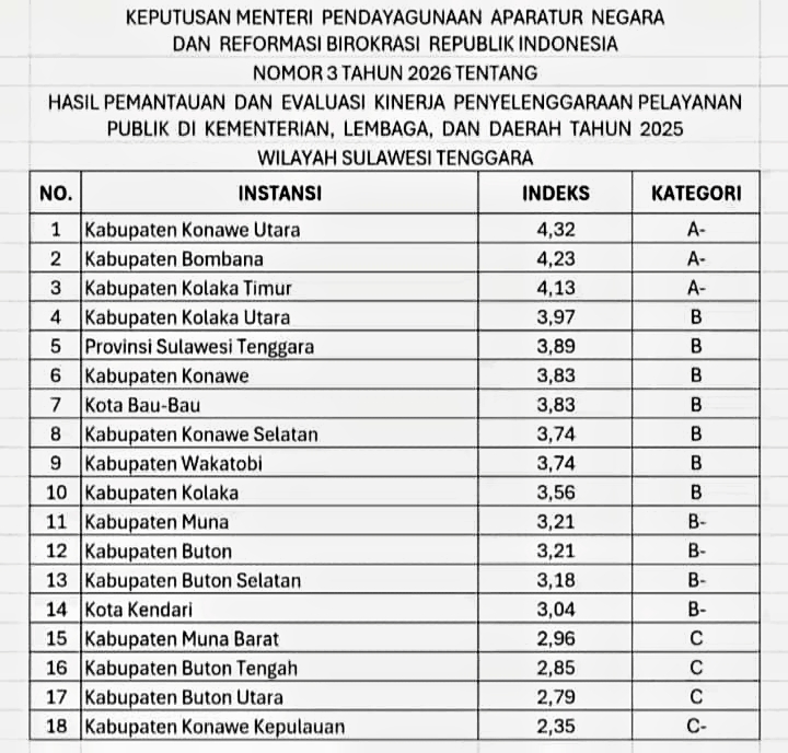 Berdasarkan hasil Pemantauan dan Evaluasi Kinerja Penyelenggaraan Pelayanan Publik (PEKPPP) oleh Kementerian Pendayagunaan Aparatur Negara dan Reformasi Birokrasi (PANRB) Tahun 2025, Konawe Utara berhasil meraih nilai 4,32 dengan kategori A- (Sangat Baik).