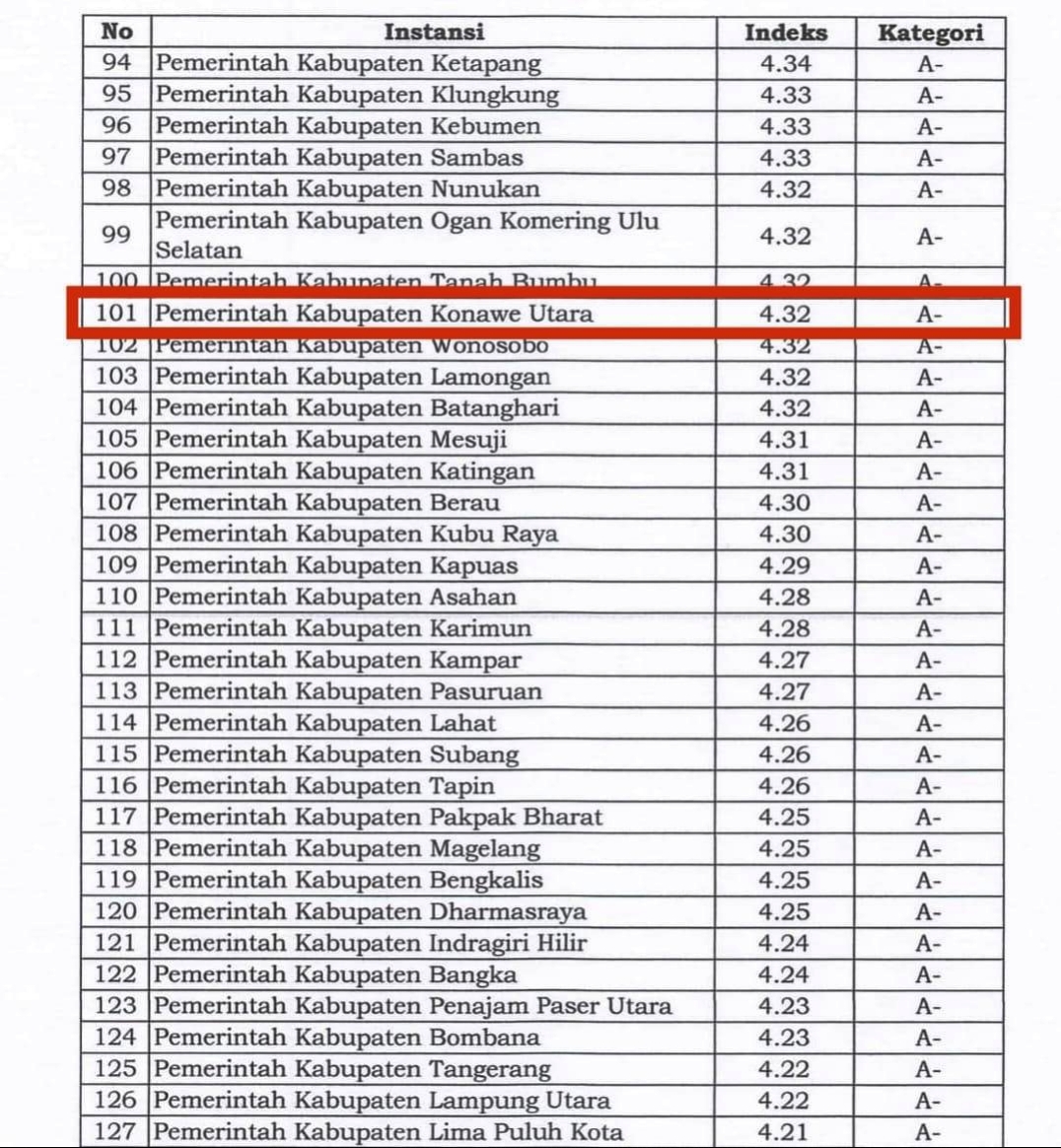 Capaian tersebut menempatkan Kabupaten Konawe Utara sebagai peringkat tertinggi di Provinsi Sulawesi Tenggara, sekaligus sejajar dengan sejumlah daerah berkinerja pelayanan publik terbaik di Indonesia.